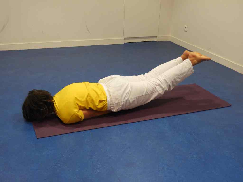 Cette posture consiste à s’allonger sur le ventre et à soulever les jambes tendues du sol.